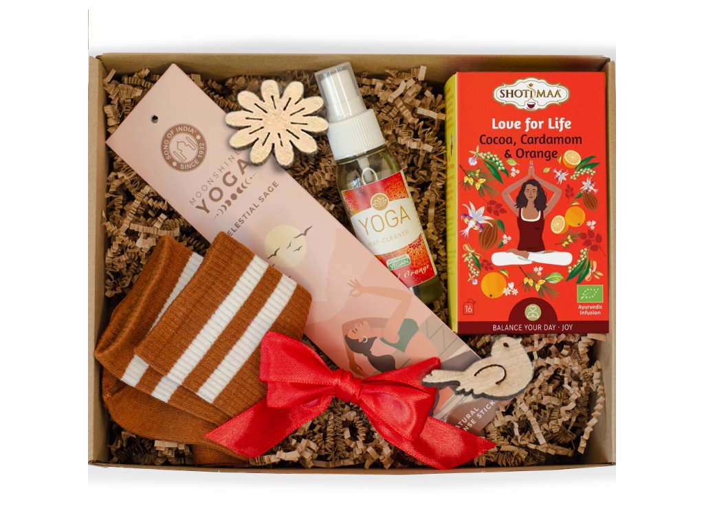 Jógová radost je dárkový balíček navržený pro ty, kdo chtějí propojit jógu s energií a pozitivní náladou. Balíček obsahuje oranžové vysoké protiskluzové ponožky, které zajistí pohodlí při pohybu, organický čaj Love for Life pro povzbuzení a osvěžení, čistící sprej na jógamatku Blood Orange a vonné tyčinky Celestial Sage, které dodávají prostoru harmonickou a povzbuzující vůni. Tento set je ideální jako dárek pro všechny, kdo hledají spojení vitality, radosti a smyslového zážitku při cvičení i relaxaci doma.