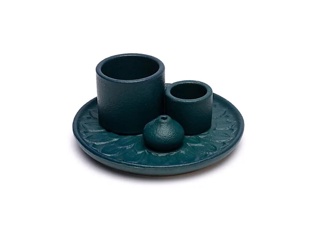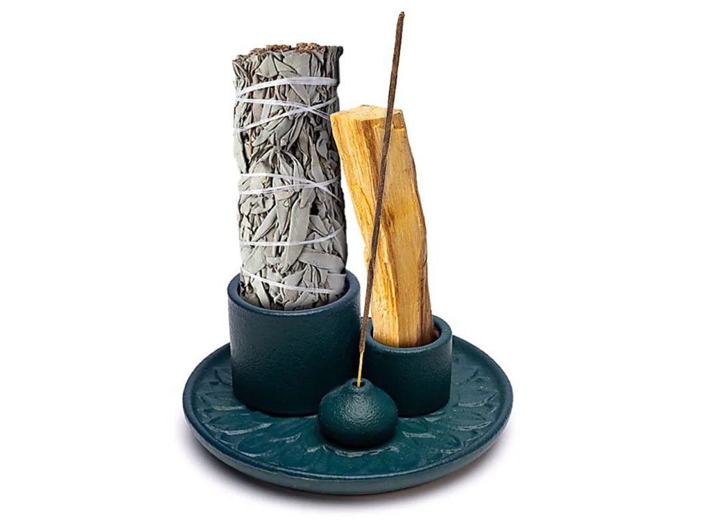 Keramický rituální držák Bloom kombinuje praktičnost s jemným květinovým motivem v petrolejové barvě, díky čemuž je ideální doplněk pro všechny, kdo chtějí bezpečně a pohodlně používat Palo Santo, vykuřovadla nebo vonné tyčinky. Keramické provedení bezpečně zachytí popel a chrání povrch pod držákem, zatímco dekorativní design dodá prostoru klidnou a harmonickou atmosféru. Kompaktní rozměry zajišťují stabilitu a diskrétní přítomnost na polici, meditačním oltáři nebo stolku.