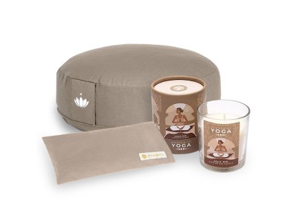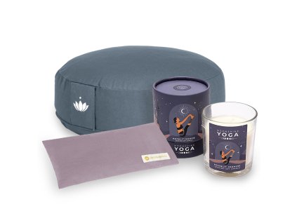 Sada meditačního polštáře, polštářku na oči a svíčky pro chvíle meditace a hluboké relaxace.