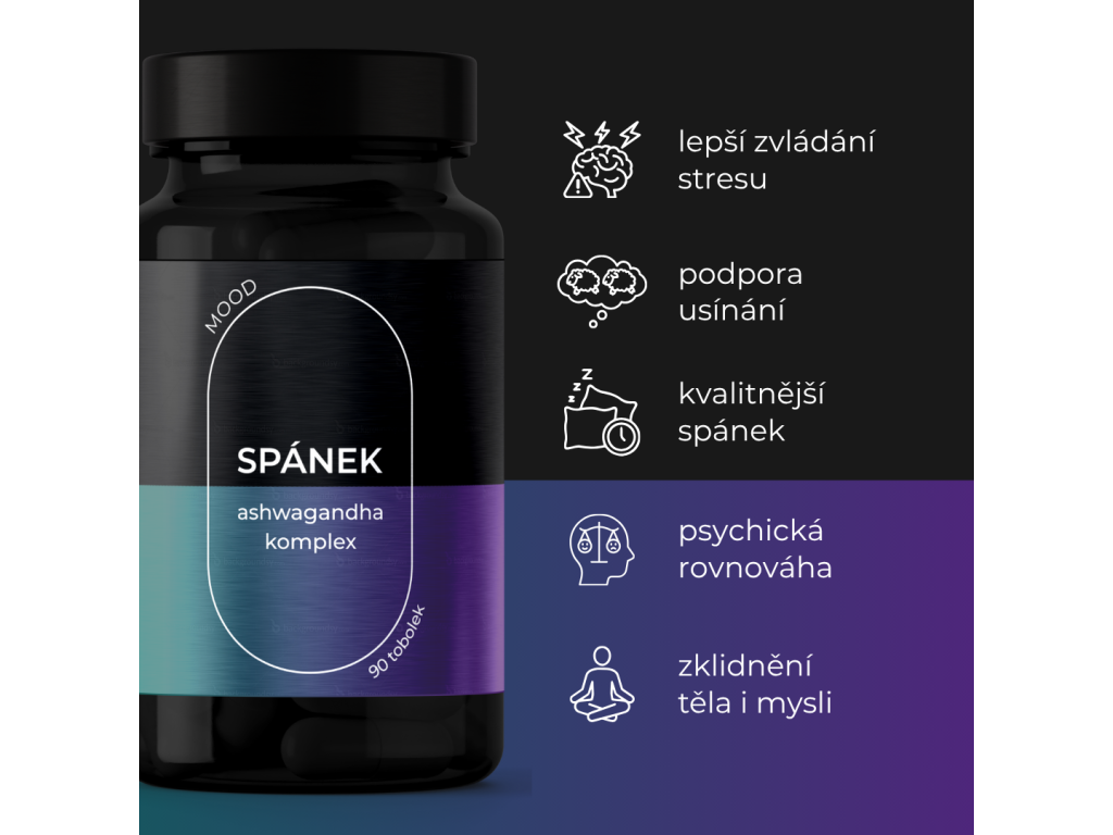 Doplněk stravy pro chvíle, kdy chceš zpomalit. Promyšlená kombinace Ashwagandhy, bylin a L-theaninu podporuje zvládání stresu, přirozené zklidnění organismu a vytváří podmínky pro kvalitní spánek.