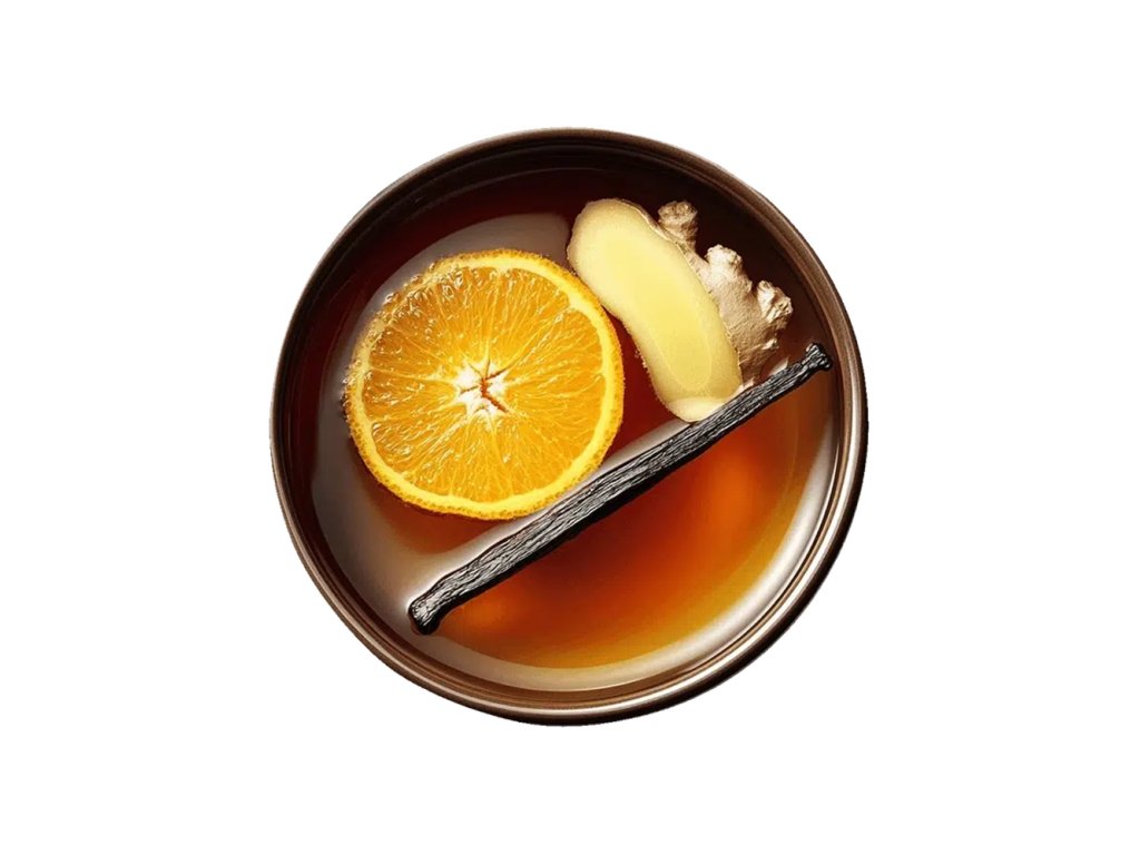 Složení: zázvor 41 %, lékořice, citronová tráva, pomerančová kůra 4 %, černý pepř, výtažek z vanilky 3 %, pomerančový olej 3 %, máta peprná 2,5 %, anýz